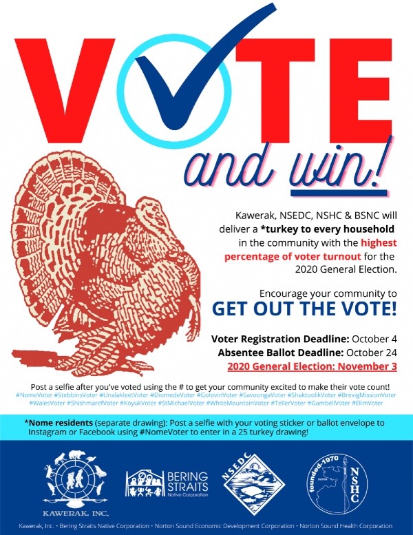 *Nome residents will participate utilizing social media hashtag #NomeVoter, to be entered into a drawing to win one of 25 turkeys! If they don’t have social media they can post their submission with their “I voted” sticker or with their mail-in ballot here!