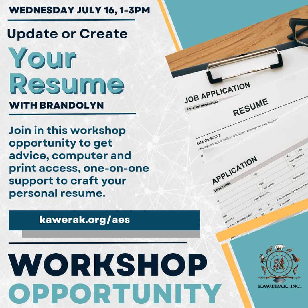 Stop on in anytime Wednesday July 16 1-3pm to the Kawerak Talialuk building for this workshop opportunity to get advice, computer and print access, one-on-one support to craft your personal resume.