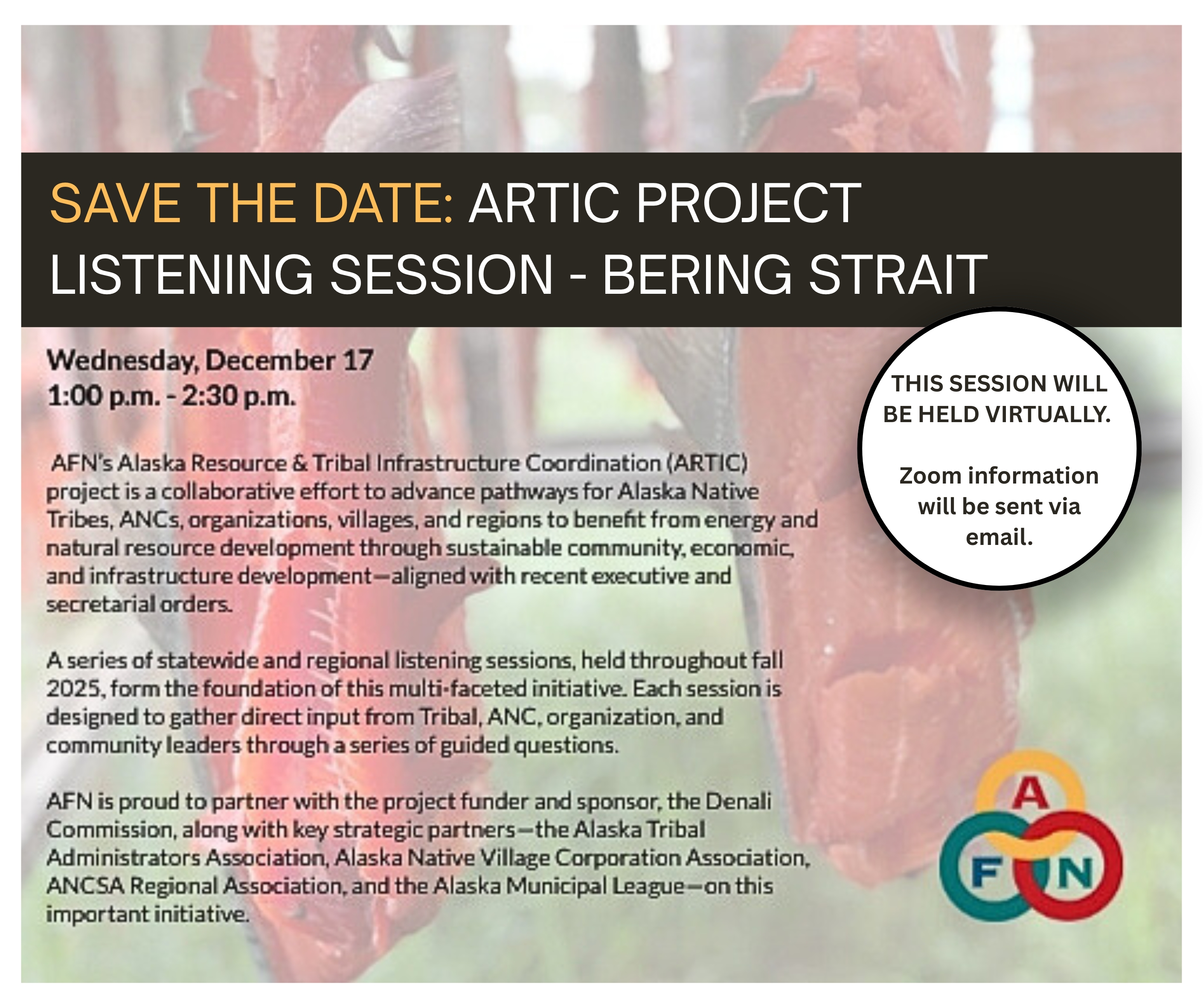 You are invited to AFN's upcoming virtual listening session regarding energy and natural resource development in Alaska on Wednesday, December 17, 2025, from 1:00 [...] |
