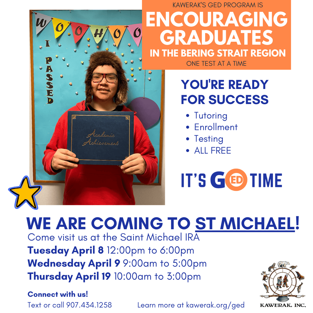 Kawerak Adult Education/GED Program will be at the Saint Michael IRA Tuesday April 8: 12 p.m. to 6 p.m. Wednesday April 9: 9 a.m. [...]