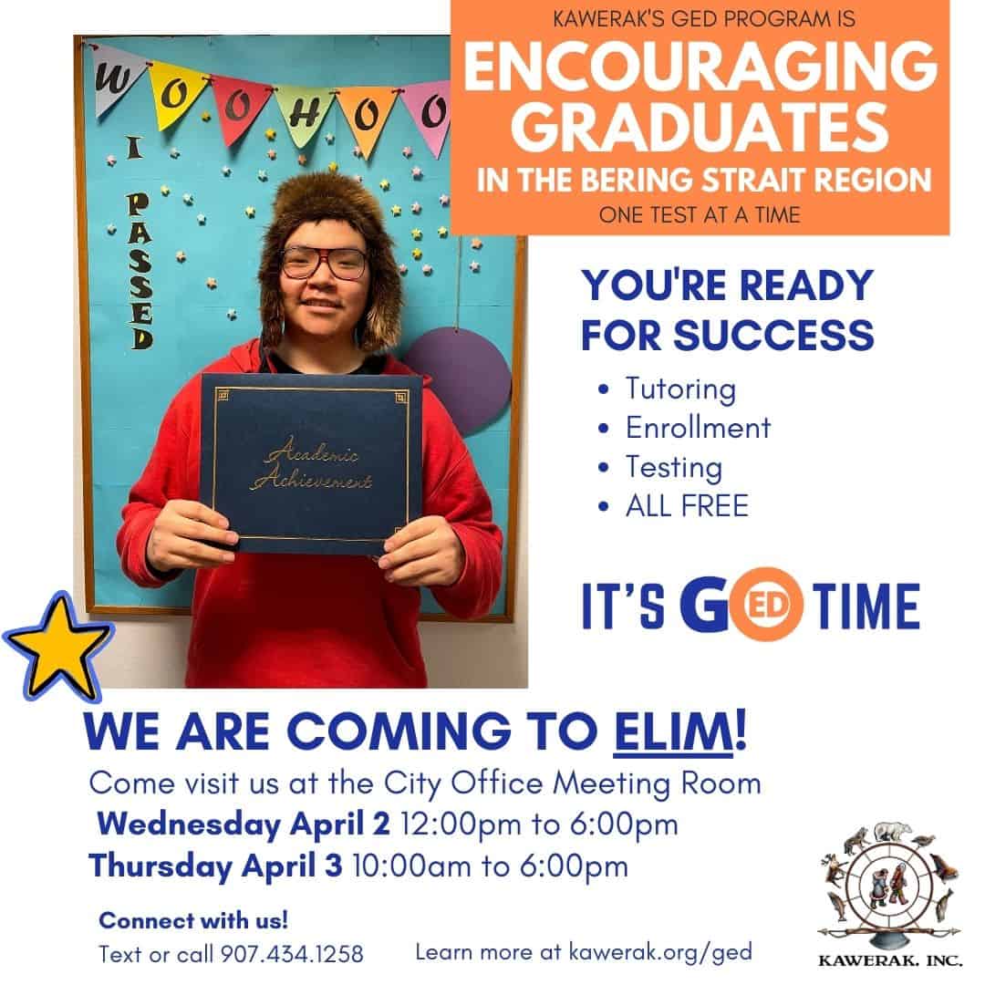 Kawerak Adult Education/GED Program will be at the Elim City Office Meeting Room Wednesday April 2: 12 p.m. - 6 p.m. Thursday April 3: [...]