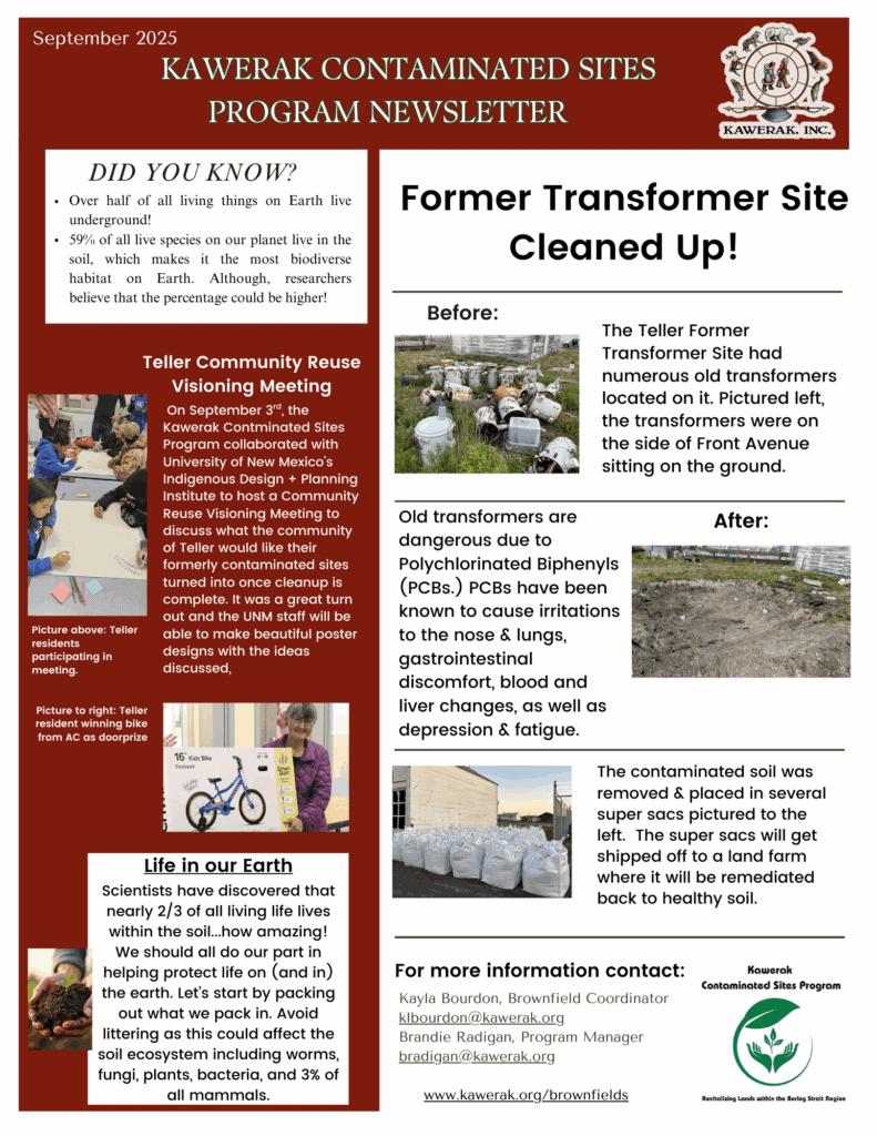 Kawerak’s Contaminated Sites Program includes the Brownfields Program, which is designed to help the region’s tribes and other stakeholders within villages work together to prevent, assess, clean-up and reuse brownfields.
