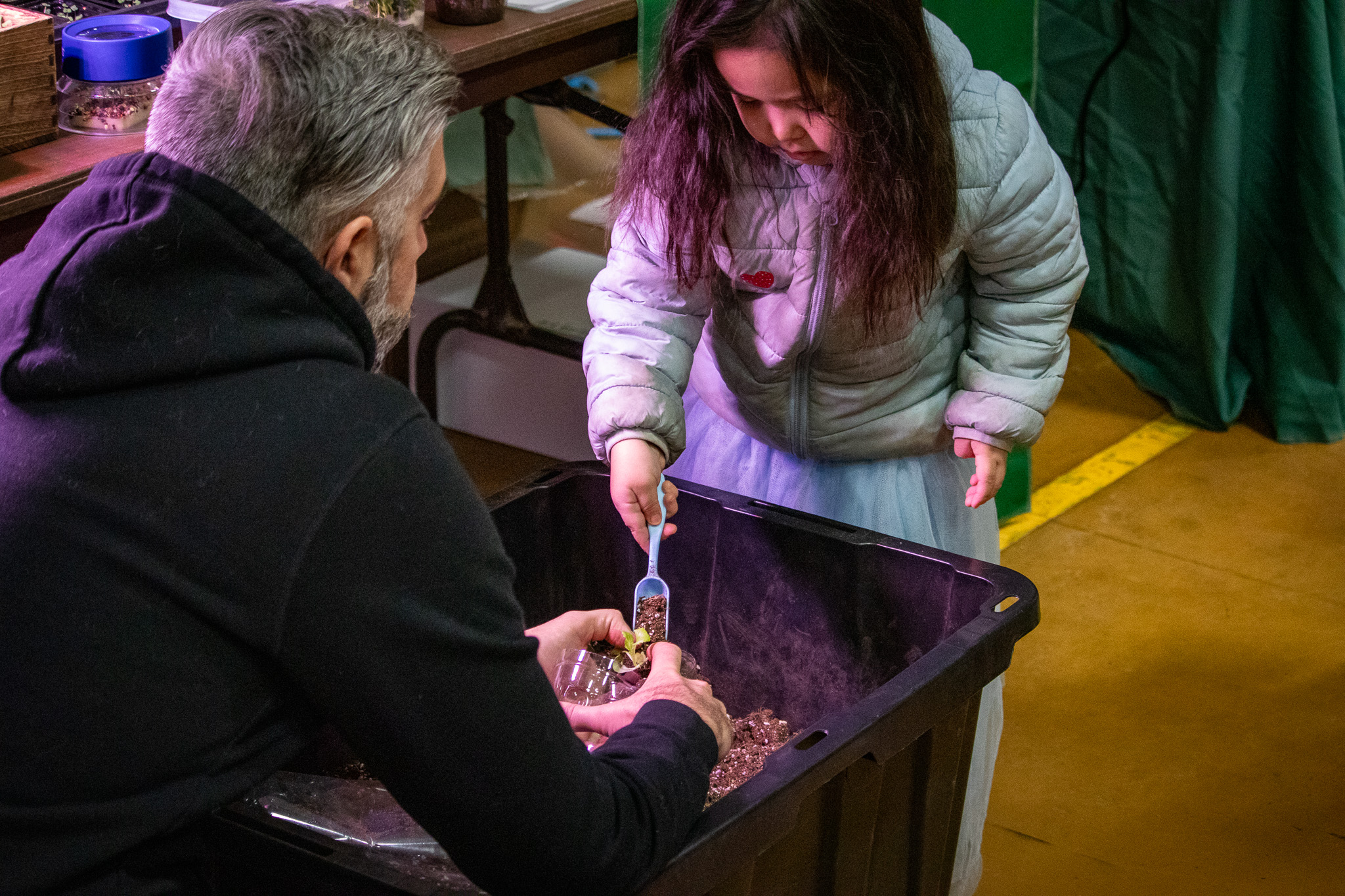Pilgrim Hot Springs staff Jeff Collins helps a young fair visitor transplant a plant start at NSHC’s Health Fair, “Rooted in Wellness.”