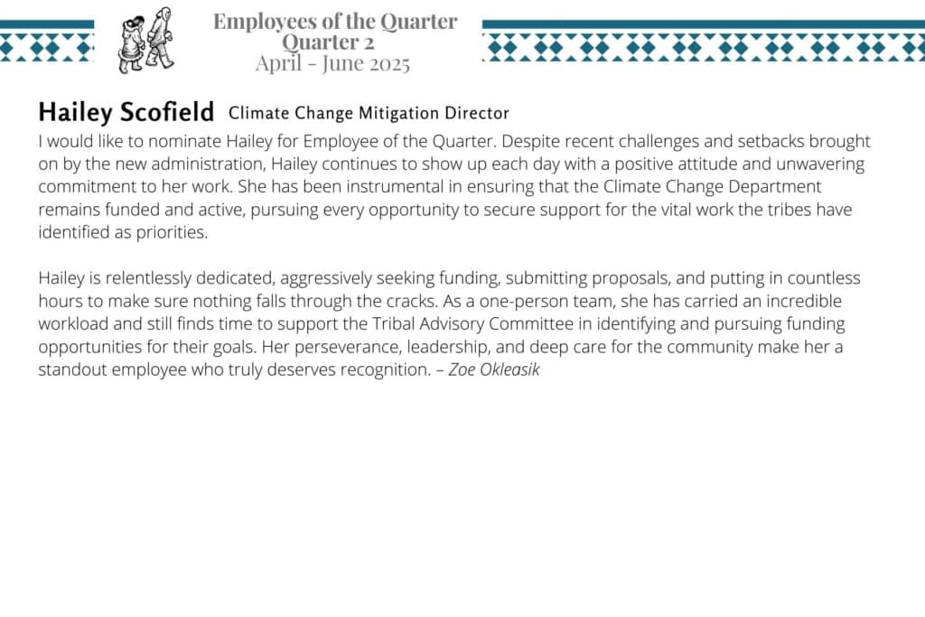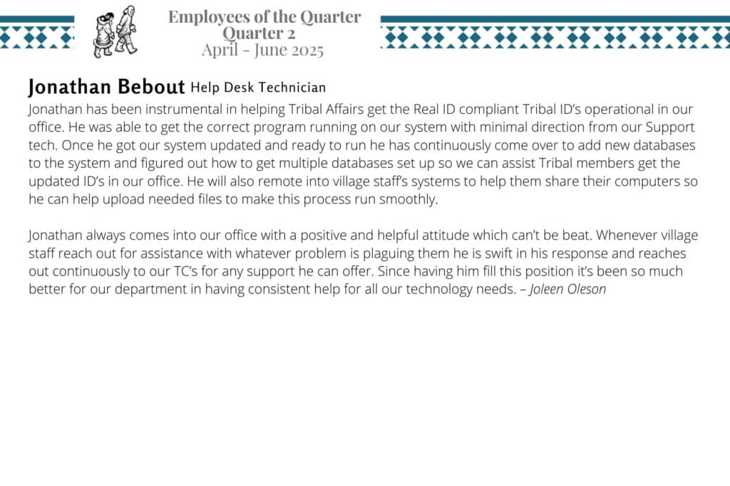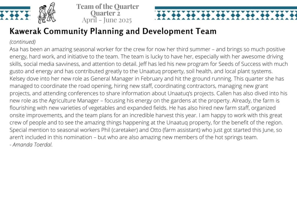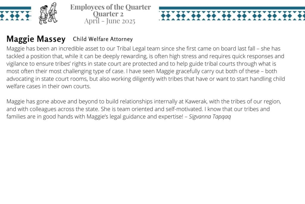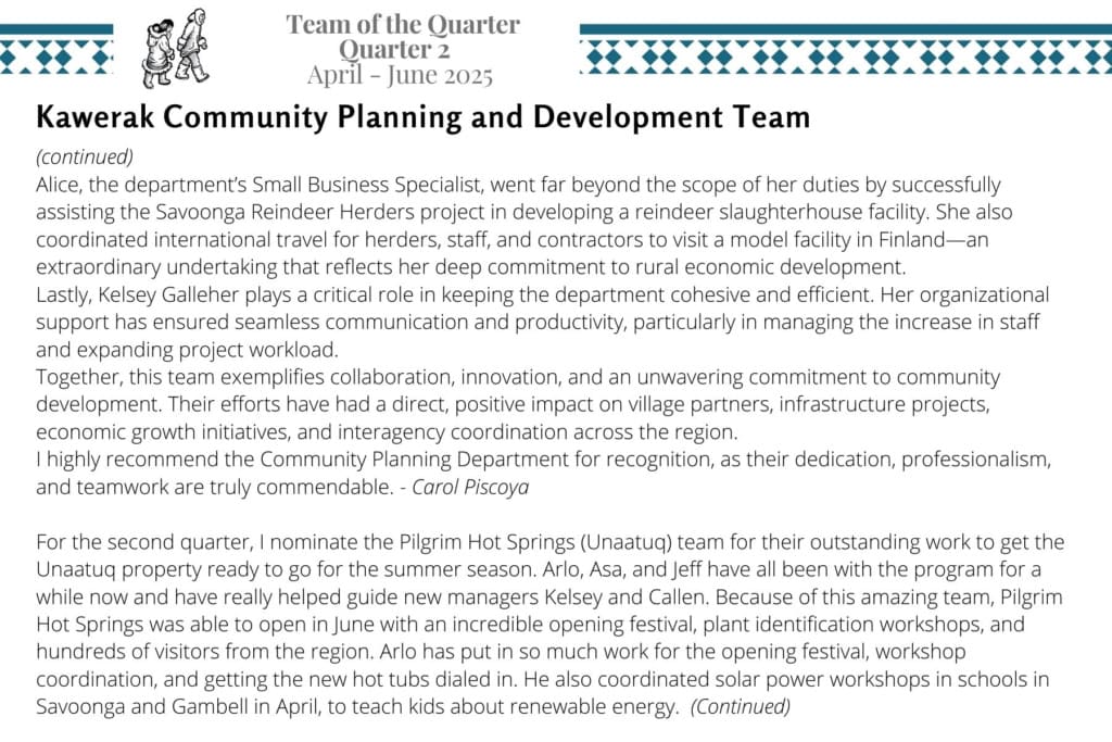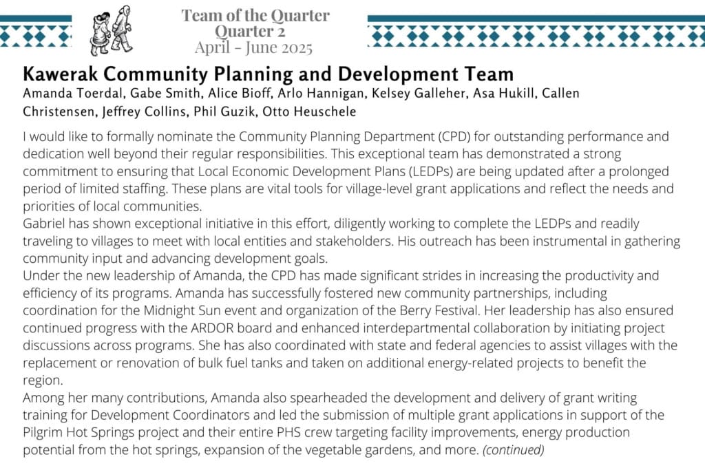Kawerak is please to announce the 2025 Quarter 2 awardees for Employee of the Quarter and Team of the Quarter. We are very fortunate to have such excellent and hard working staff and we appreciate all that they do!