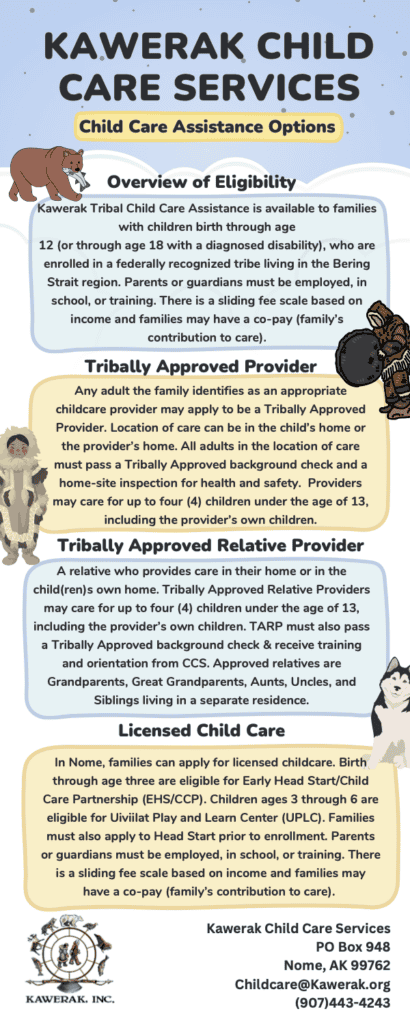 The Kawerak Child Care Assistance Program provides financial assistance to eligible Alaska Native families who are working, attending job training or school, subsisting or seeking work who are in need child care services.
